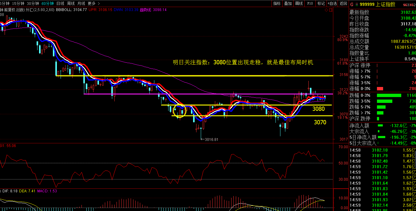 从指数上来看,中小创与权重走出分化更是严重,创业板面临再次破新低的挑战,对市场投资者难免会造成一定的恐慌情绪。但是对于整个市场来讲下跌的空间依然有限,明天礼拜五各位投资者不用太过于担忧。只要严格按照我老张的操作策略,把仓位控制好,进可攻,退可守,不存在被动。如果明天上证指数破3100落到3080点位置出现启稳的信号,就是我们布局的最佳时机。