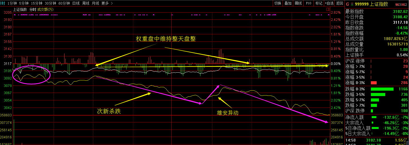 市场依然如我老张的预期低开低走在3100点位附近震荡调整,再一度证明老张对市场的判断是心中有数,行情一切符合我之前的预期走势。所以近期有不少朋友问我老张什么时候建票,问我为什么还要压着不建仓,我想告诉大家不是市场没有机会,而是我的操作风格是做大概率,出击必要赢的结果。而不是随随便便,不负责任的这么一个人,再者目前还没有出现,能够撬动市场行情反转的主流热点板块的情况下。雄安新区依然是亮点,但也走出分化,一冷一热的格局,次新盘中杀跌,即使布局我们多以短线抢反弹为主,快进快出。