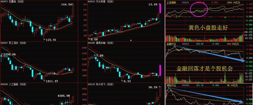 新能源的石墨烯不错,继续发力,这次方大炭素突然涨停,华丽家族也不错,算是回到之前的老本行了,这才是标志性代表,军工混改也不错,其中的晋西车轴涨停,算是多个概念了,有一带一路、央企改革和军工混改的多重概念。还有我们提及的人工智能,科大讯飞剑指涨停板,若不是这票分量重点也要奔板去了。看看今天的大盘分时和金融、保险的分时,金融的回落才是个股的机会,随后大盘分时小盘股开始切换走好,午后可以说是一路高歌,多处开花。这些容易炒作的概念继续关注:军工、新能源、基建、环保、电子、人工智能等。