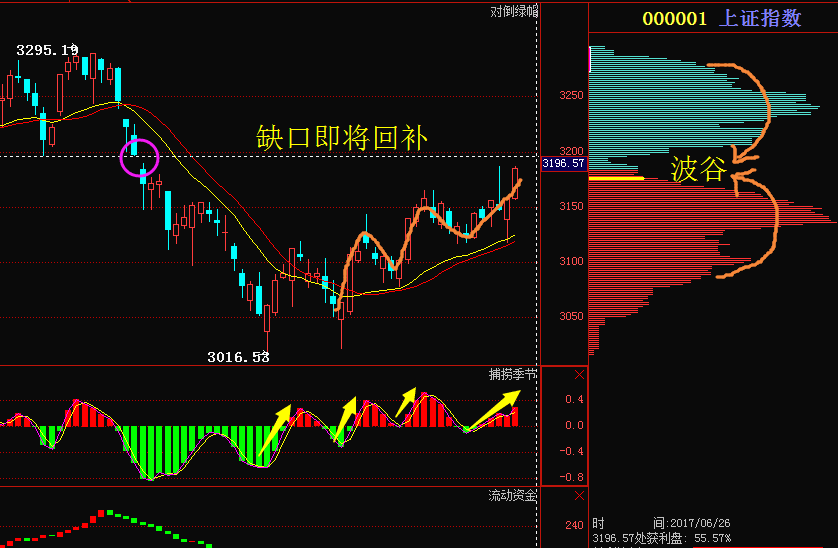 今天大盘延续上周五的反抽行情,指数上涨27点,技术上来看,走势一直呈现震荡上行,加上这几天的资金在流入,短期大盘有望回补第一缺口3196点。同时,大盘也有再此位置震荡的要求,因为从筹码分布看到的现象是目前刚好是波谷的位置,目前大盘呈现双峰,当市场震荡的时候就会导致底部和顶部的筹码进行减少。总之指数还会横盘震荡,但是不用担心赚钱效应,因为指数分化,个股照样有炒作机会!