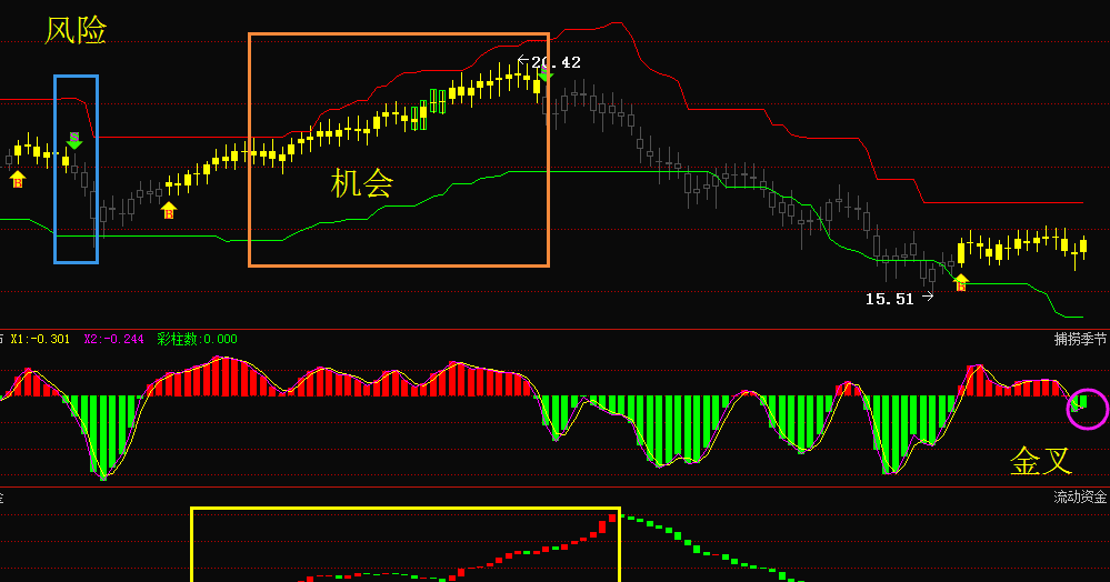 现在再看平均股价,似乎离风险越来越远了,今天两市翻红的股票2600多只,翻绿的也就300多,所以整体的赚钱效应还是不错,再看看流动资金,继续翻红,捕捞季节出现金叉,算是脱离了风险区域。但居安思危的意识还是要有的,如果哪天再遇到s点或者牛线下移那还是要小心的。