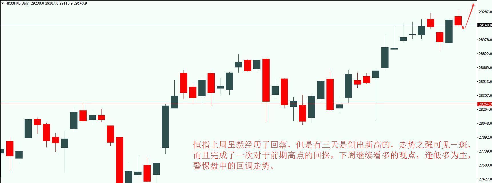 恒指上周虽然经历了回落,但是有三天是创出新高的,走势之强可见一斑,而且完成了一次对于前期高点的回探,下周继续看多的观点,逢低多为主,警惕盘中的回调走势。