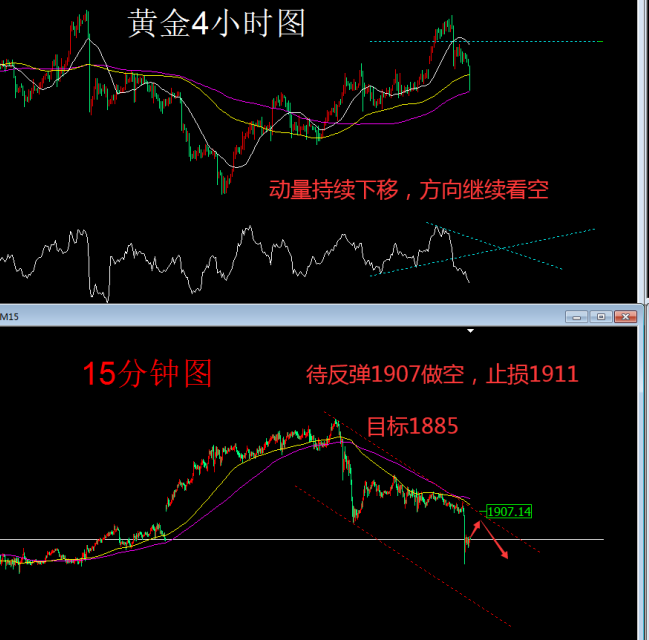目前四小时图来看,方向继续看空,只要有反弹都 是做空的机会!晚间非农前,要做空只能在1907,否则就观望,等非农公布的结果,顺势而为!