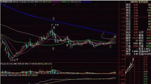 4.脚背在D的位置,它是250日价格平均线,即年线,其自然的弯曲线条,形成脚背图形。