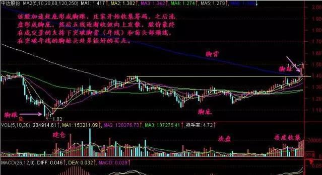 1.脚跟在A处,股价经过最后快速打压,最坚定的持股者也难免跟风卖出股票。然后,庄家反手做多,加快捡筹码,股价上升。这一跌一涨,形成脚跟图形。