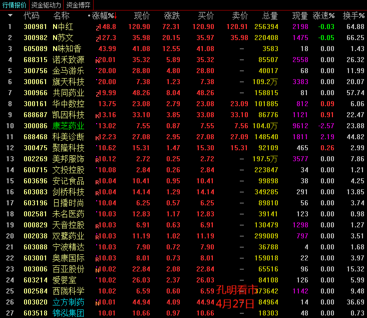 中线跟踪的个股,持续纷纷轮番表现,市场上,孔明监测今天最活跃的个股有康芝药业、立方制药、锦泓集团、朗姿股份、奥园美谷、长江健康、科大国创、葫芦娃、热景生物、智度股份等。