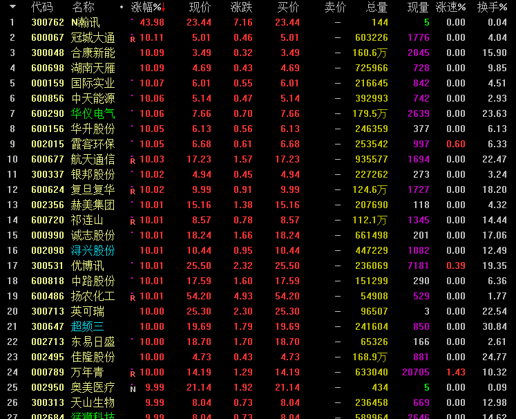 股指近期放量上涨,相继站上2800、2900、3000点,市场强势股活跃后获利回吐,短期板块轮动效应显著,近期低价超跌再获资金关注开始出现补涨行情。受此影响,孔明监测到今天冠城大通、合康新能、湖南天雁、中天能源、华仪电气、银邦股份、祁连山、浔兴股份、中路股份、英可瑞、超频三、东易日盛、天山生物、星云股份、银亿股份、厚普股份、华谊嘉信、福临精工、泰尔股份、猛狮科技个股最高涨停。
