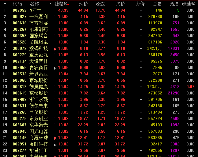 股指近期放量上涨,相继站上2800、2900、3000点,市场强势股活跃后获利回吐,短期板块轮动效应显著,近期低价超跌再获资金关注开始出现补涨行情。受此影响,孔明监测到今天一汽夏利、万方发展、尔康制药、国旅联合、长航凤凰、京汉股份、浙江永强、德尔未来、京华激光、国光电器、商赢环球、苏奥传感、多喜爱、金盾股份、美盛文化、华录百纳、华仁药业、搜于特个股最高涨停。