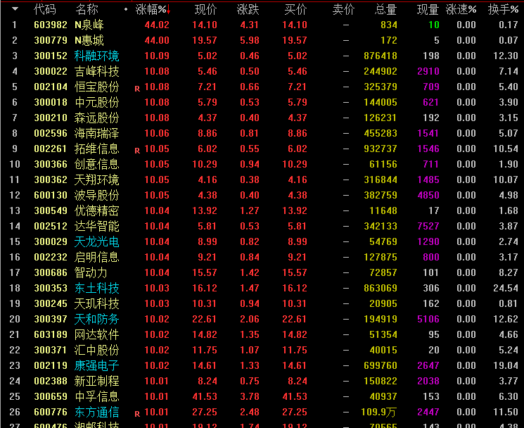 中线跟踪的个股,持续纷纷轮番表现,市场上,孔明监测今天最活跃的个股有科融环境、天龙光电、东土科技、天和防务、康强电子、东方通信、中国软件、佳创视讯、丰乐种业、汇金科技、浪潮软件、农发种业、海南高速、金力永磁、吴通控股、浙大网新、海峡股份、东信和平、登海种业、泰晶科技、宏辉果蔬、远望谷、宜通世纪、英洛华、士兰微等。