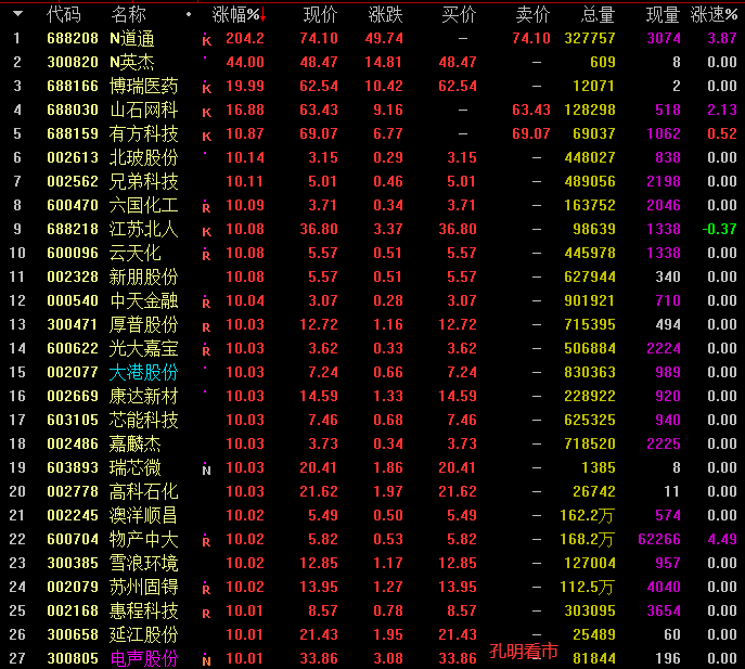 次新股的上涨主要源于两方面:一方面,新股中签率低,吸引资金爆炒。另一方面,次新股尤其是小股本次新股具备强大的股本扩张预期。受此影响,孔明监测到今天有博瑞医药、山石网科、有方科技、江苏北人、瑞芯微、电声股份、公牛集团、卓胜微、中科软、博杰股份、左江科技、斯达半导、艾可蓝、耐普矿机等个最高涨停。