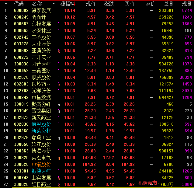 土地流转出现异动。受此影响,孔明监测到今天海航创新、京投发展、中国武夷、亚通股份、中华企业、吉林森工、永安林业、上实发展、新野纺织等个股最高涨停。