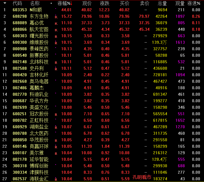 次新股的上涨主要源于两方面:一方面,新股中签率低,吸引资金爆炒。另一方面,次新股尤其是小股本次新股具备强大的股本扩张预期。受此影响,孔明监测到今天有东方生物、喜必优、航天宏图、测绘股份、玉禾田、阿尔特、中国卫通等个最高涨停。