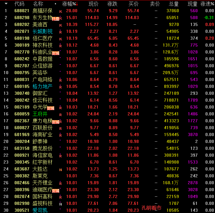 次新股的上涨主要源于两方面:一方面,新股中签率低,吸引资金爆炒。另一方面,次新股尤其是小股本次新股具备强大的股本扩张预期。受此影响,孔明监测到今天有奥福环保、东方生物、美迪西、佰仁医疗、大胜达、盛视科技、佰奥智能、仙乐健康。新产业、三人行、八方股份、万泰生物、艾可蓝、龙磁科技、派瑞股份、中国卫通、国联股份等个最高涨停。