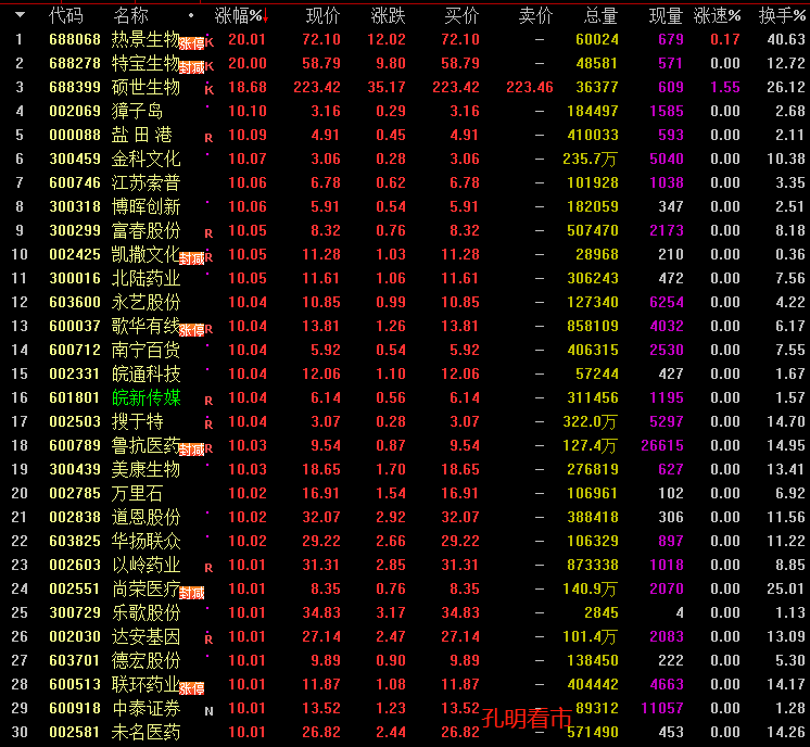 医药股出现异动。受此影响,孔明监测到今天特宝生物、北陆药业、鲁抗医药、以岭药业、达安基因、联环药业、未名医药、奥翔药业、赛升药业、贵州三力、新光药业、四环生物、华北制药、益佰制药等个股最高涨停。