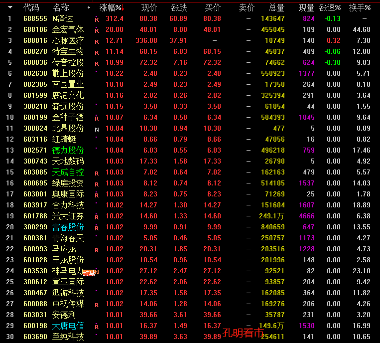 次新股的上涨主要源于两方面:一方面,新股中签率低,吸引资金爆炒。另一方面,次新股尤其是小股本次新股具备强大的股本扩张预期。受此影响,孔明监测到今天有金宏气体、心脉医疗、传音控股、特宝生物、北鼎股份、神马电力、聚合顺、康华生物、帝科股份等个最高涨停。