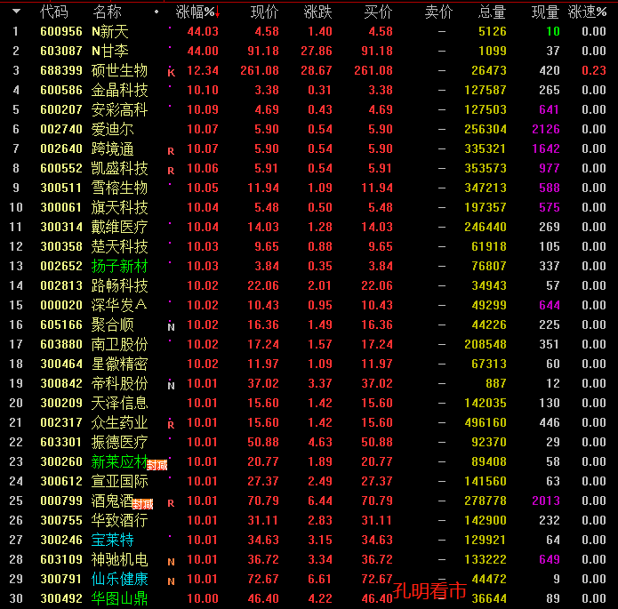 次新股的上涨主要源于两方面:一方面,新股中签率低,吸引资金爆炒。另一方面,次新股尤其是小股本次新股具备强大的股本扩张预期。受此影响,孔明监测到今天有硕世生物、聚合顺、帝科股份、四川金顶、仙乐健康、康华生物、北鼎股份等个最高涨停。