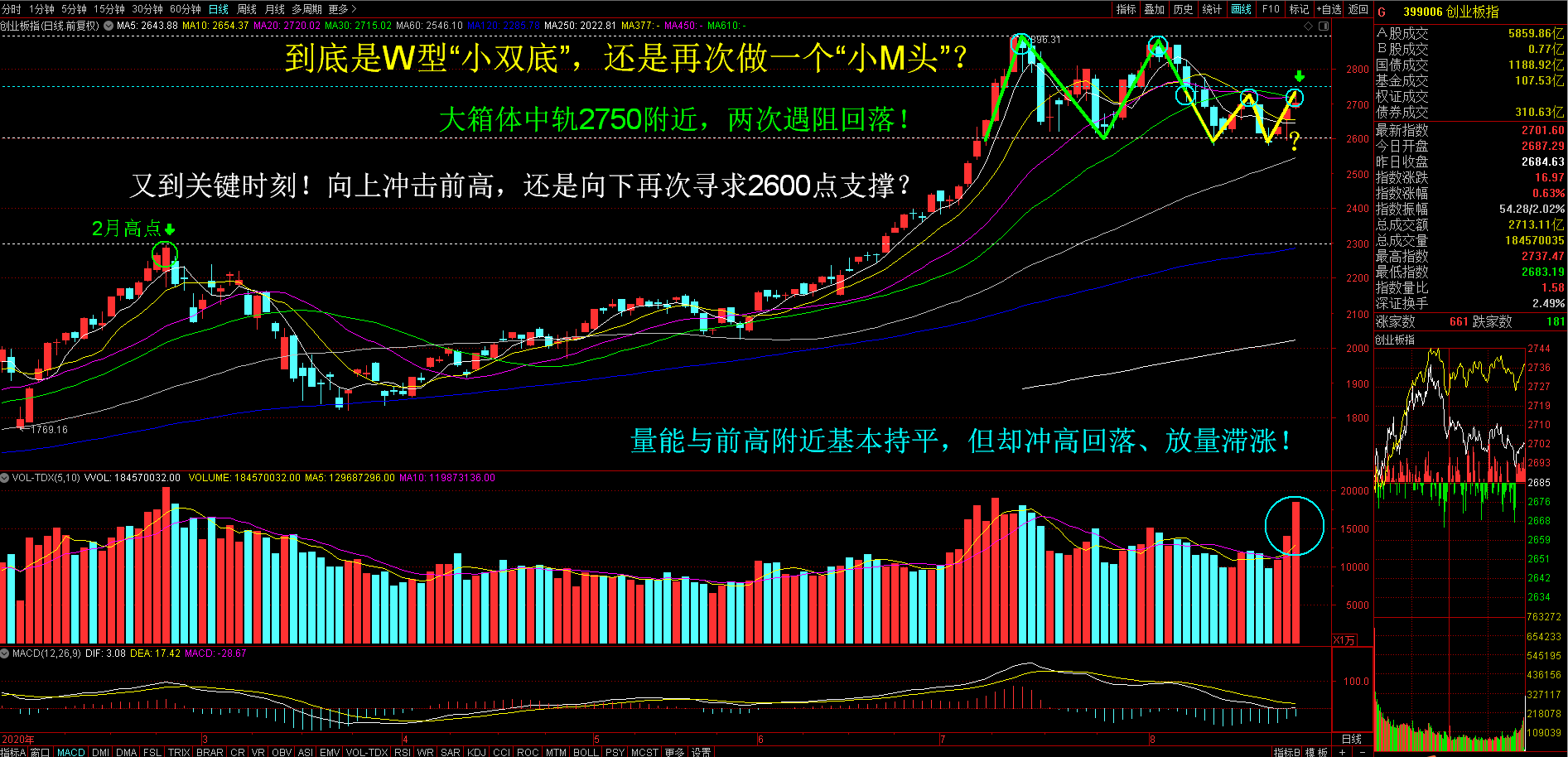 大家注意一下图中划线,继前期构筑大“M头双顶”形态后,创业板指数始终未有效跌破2600颈线位。再次测试2600一线支撑后,继续向上反弹,走“大箱体”机构。但时至今日,创业板再次走到了关键时刻!短线到底是W型“小双底”呢,还是在中轨线2750之下,再次构筑一个“小M头”?