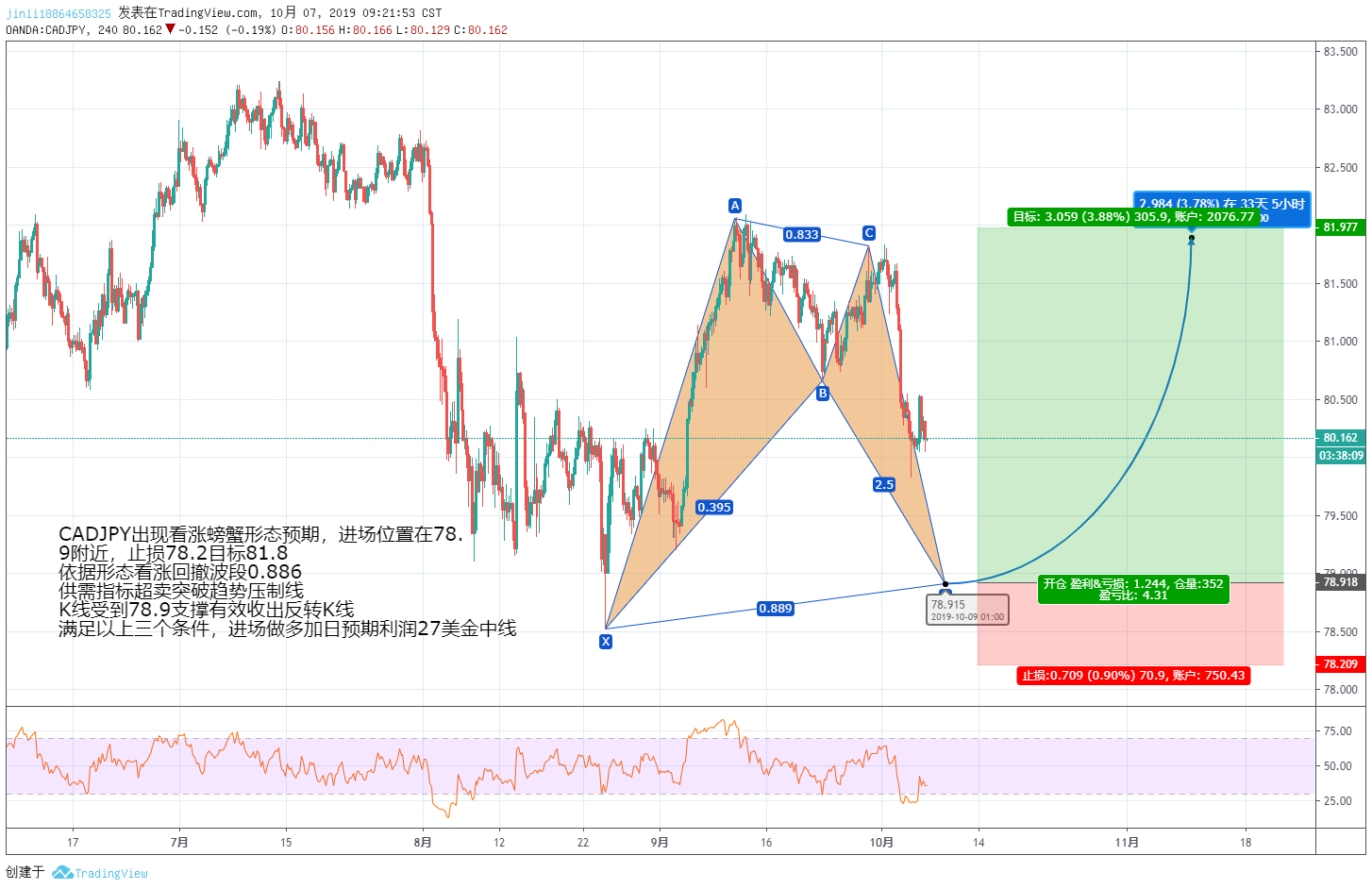 近期加元兑日元在技术面来看,出现了看涨的螃蟹形态预期,进场位置再78.9附近,止损78.2目标看向81.8