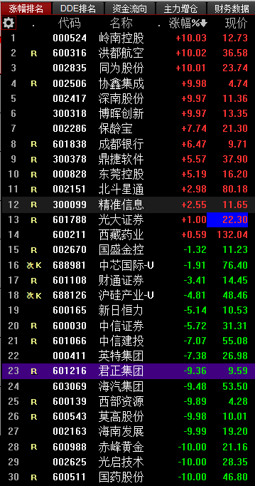 高位人气股方面,君正集团,大跌;光启技术,跌停;东莞控股,调整,止步8天7板;精准信息、莫高股份,调整,止步6连板;协鑫集成,涨停,5天4板;深南股份,涨停,4连板;红宝丽、航天机电、渤海轮渡,涨停,3连板。另外,博晖创新、保龄宝、亚宝药业、洪都航空、岭南控股、鼎捷软件等大涨或涨停;而,中信建投、英特集团、海汽集团、莫高股份、西部资源、国药股份、赤峰黄金等人气股大跌或跌停。