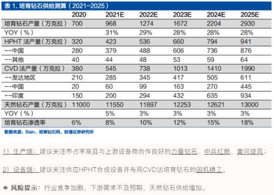 目前全球培育钻石渗透率仅4%,与天然钻价格差异扩大后性价比优势凸显,下游需求有望进一步提升。我国培育钻石生产以高温高压法为主,产能集中在河南地区。行业龙头扩产提速,生产端集中度有望进一步提升。