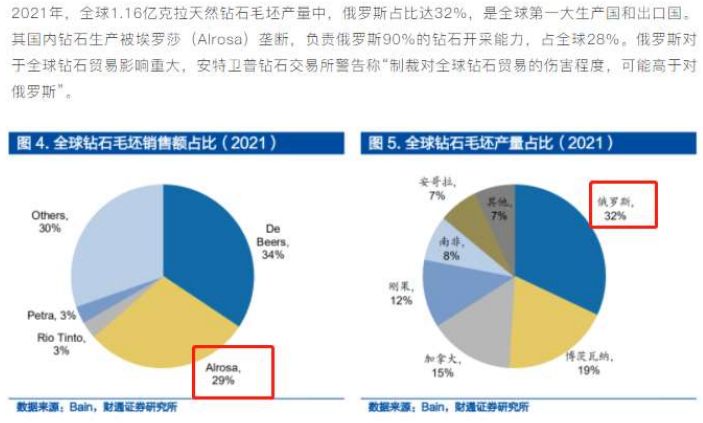 财通证券指出,俄罗斯占据全球天然钻石毛坯产量中的32%,是全球第一大生产国和出口国,由于受到制裁,将扰动全球天然钻石供给。