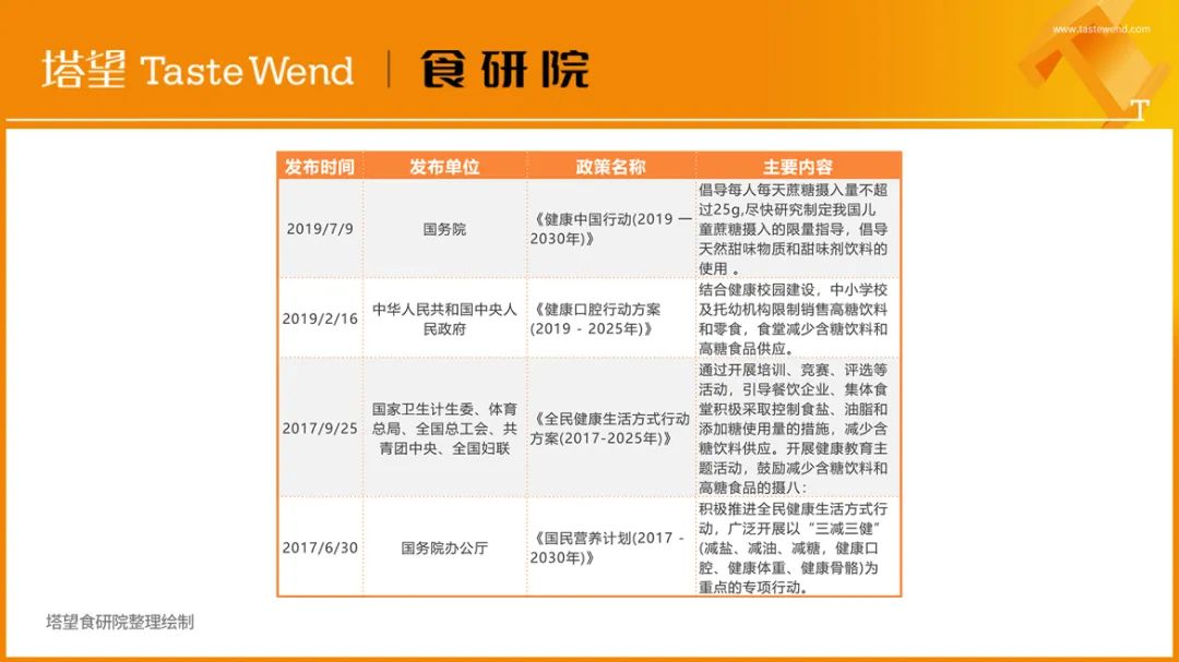 从2017年国家政策就开始引导饮料行业向着健康化、低糖、无糖的方向发展,尤其是2019年健康中国行动的颁布,进一步要求饮料行业向着天然化和健康化发展。