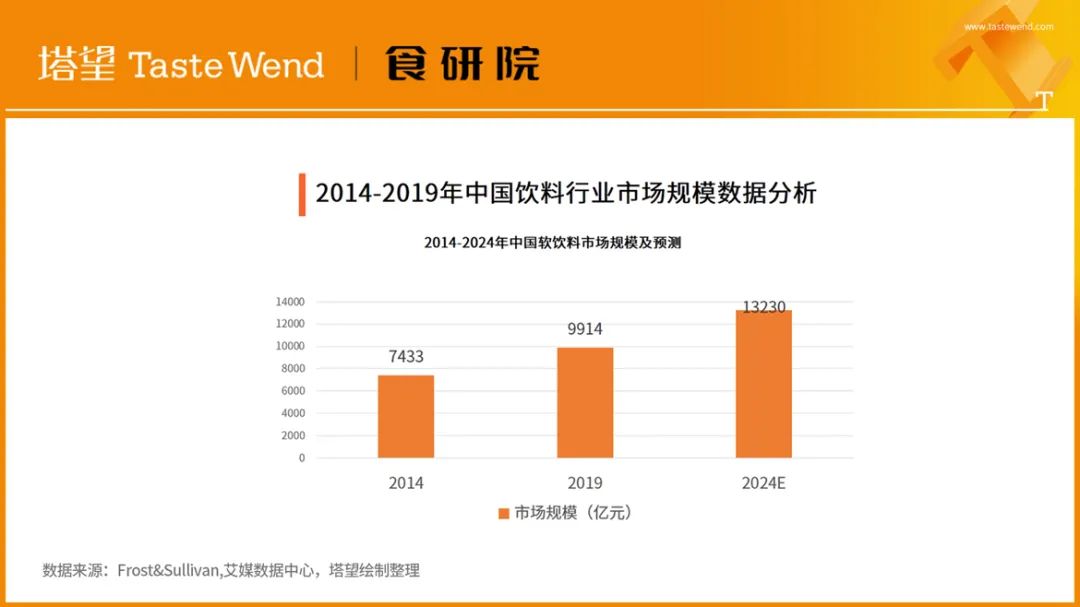 2014-2019年中国软饮料市场规模持续上升,2019年中国整体软饮料市场销售收入达到9914亿元,五年间年均复合增长率5.9%。按2014-2019年的复合增长率计算,2020年中国软饮料市场规模将突破万亿,2024年有望达到13230亿元。万亿俱乐部,每年几千亿的增长,这么看来饮料貌似是个体量够大,持续增长的好生意,这也不难想到,元气森林进入品类首选了饮料这个大赛道了。