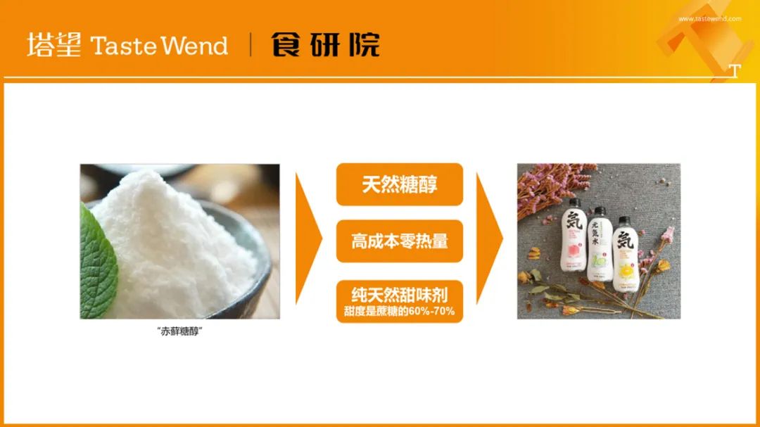 元气森林为了实现零糖与口味兼容的落地,采用天然的“赤藓糖醇”为代糖,它的甜度是蔗糖的60%-70%,最大程度还原蔗糖的口感。这成为了气泡水满足口味需求的核心亮点,调制的水果口味清新淡雅,从消费者导向来看待不管畅爽还是健康,饮料毕竟是需要更好的满足口味需要的。