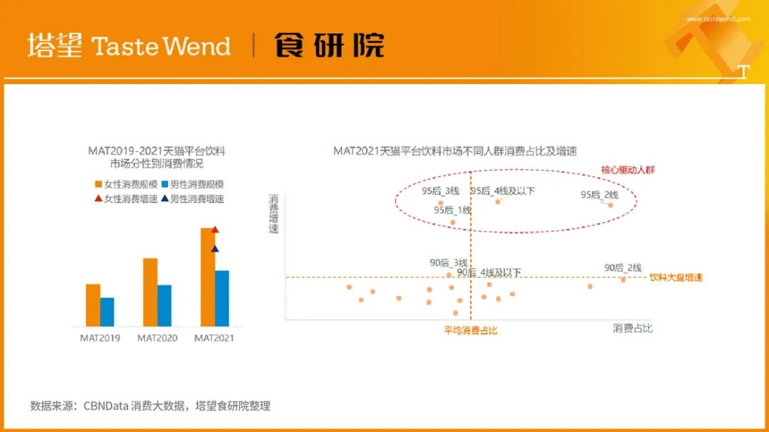 根据2019年的消费者调研,女性以高占比、高增速成为饮料市场核心人群,95后年轻人以高消费增速成为驱动饮料大盘增长的增量人群,且消费下沉趋势明显,低级别城市的增速更高。