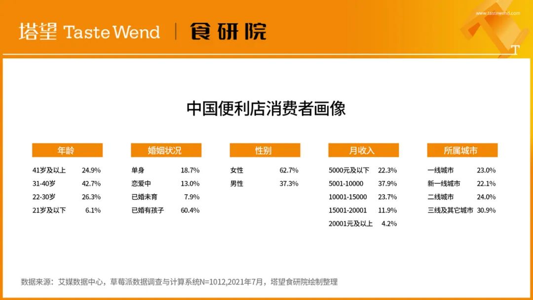 iiMedia Research(艾媒咨询)数据显示,便利店消费者的年龄集中分布在31-40岁(42.7%)、22-30岁(26.3%),60.4%的消费者已育有孩子,37.9%月收入在5000-10000元。