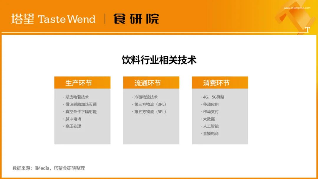 饮料行业技术覆盖从生产、流通和消费三大环节,生产环节与消费环节技术的呼应,能有效的促进饮料产品的更新换代,更加贴近市场的需求。而流通环节技术的发展提高了消费者的体验感,辅助功能十分突出。