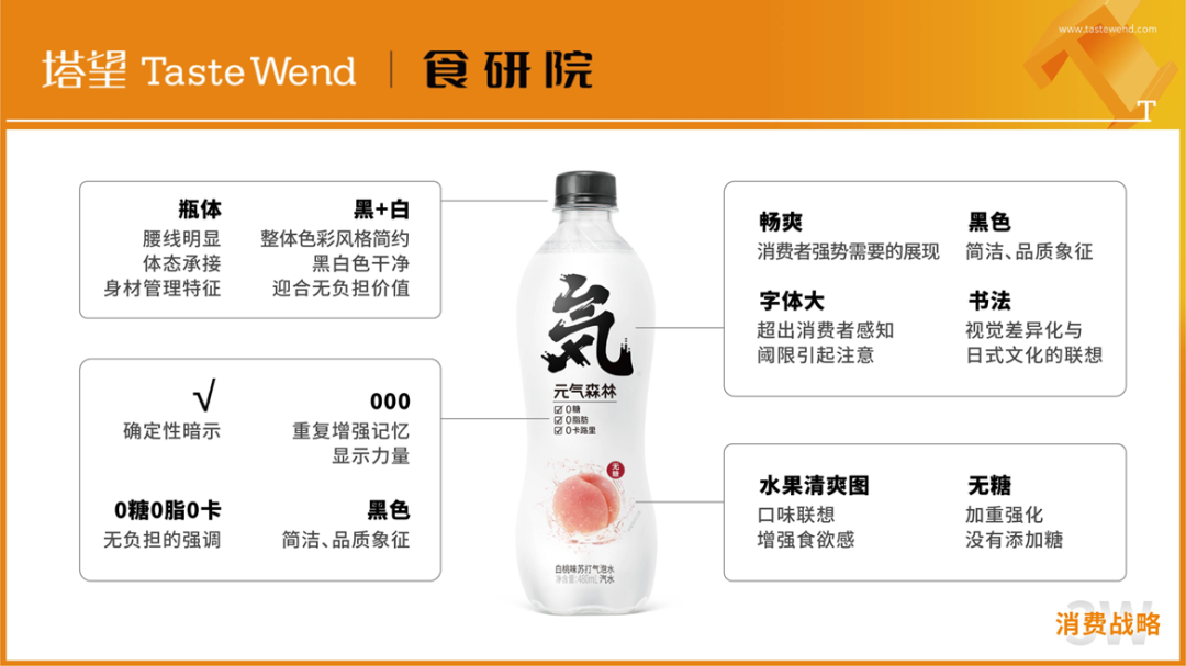 产品形象打造方面,元气森林更加消费者导向了,我们都非常熟悉的大大的“気”字包装。这里面浓浓的消费烙印技巧。“消费烙印体系”是消费战略在品牌打造中非常重要的方法,底层逻辑源自认知心理学。