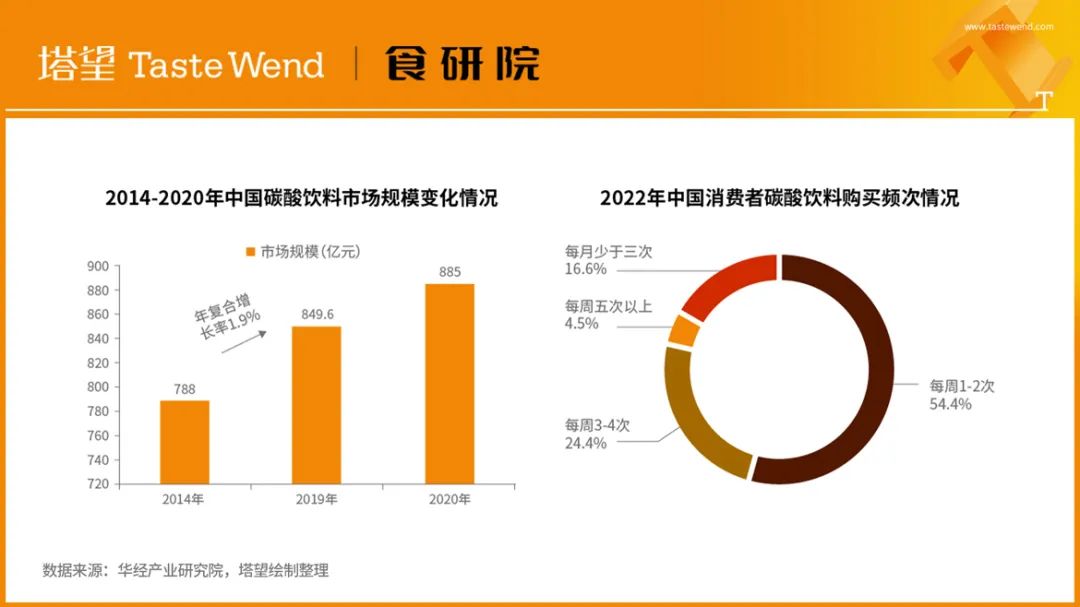 根据数据统计,2019年中国碳酸饮料市场规模在849.6亿,2020年增长至885亿元,年复合增长率仅为1.9%。造成碳酸饮料低增长的原因在于,部分碳酸饮料存在不健康的成分,违背了消费者的健康消费理念,导致消费者对碳酸饮料的需求降低。