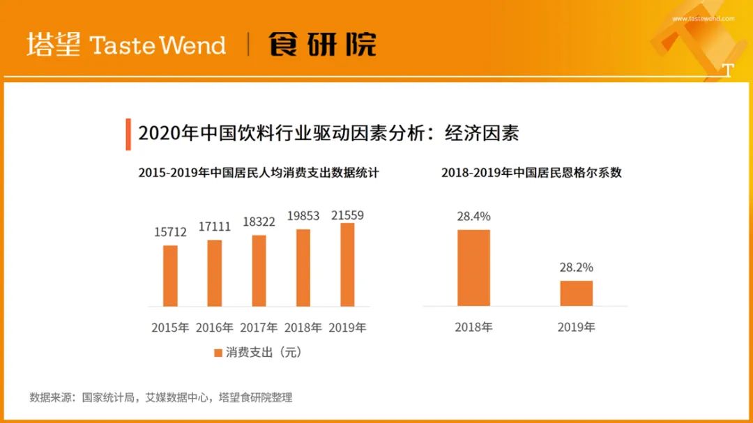 数据显示,2019年,中国居民人均消费支出21559元,首次超过2万元,增长8.6%,比上年加快0.2个百分点,扣除价格因素影响,居民人均消费支出实际增长5.5%。全国居民恩格尔系数为28.2%,比上年下降0.2个百分点。随着中国居民消费能力提升,人均消费支出增加,同时,食品在消费支出中所占比例减少,这意味着家庭收入的增加和人民生活日趋向好,有利于饮料行业的发展。