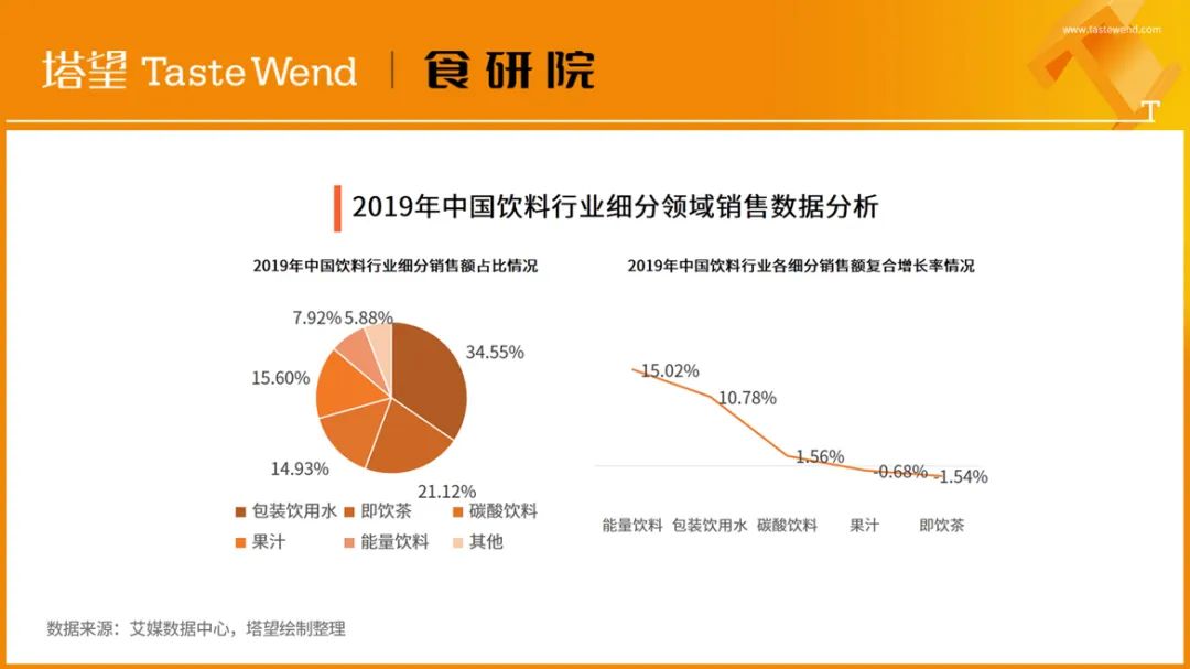 再看2019年,中国饮料市场以包装饮用水和即饮茶饮料为主,二者市场份额超过半成。此外,能量饮料在2019年期间销售额复合增长率高达15.02% ,成为发展最快的饮料细分品类。碳酸饮料、果汁、即饮茶则出现较低甚至是负增长的情况。