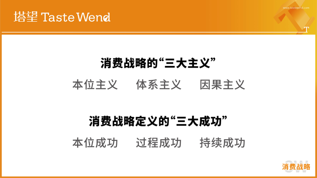 塔望消费战略倡导以消费者为导向的三大主义:本位主义、体系主义、因果主义。本位主义代表着品牌和产品要在根本上以目标消费者为核心研究消费者的机会需求,以机会需求为对应形成品牌定位,品牌战略体系。