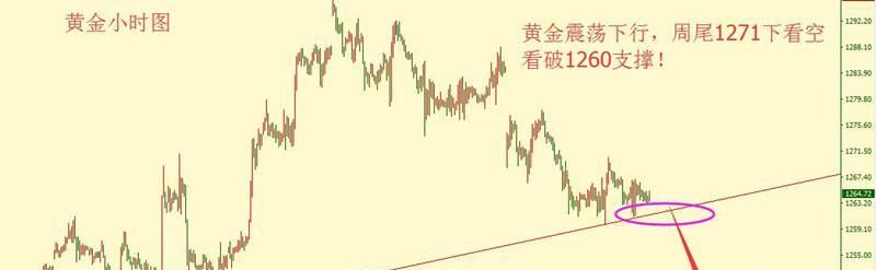 日线的规律性不强,短线只能说在1260之上震荡,所以关键点就是1260支撑,也就是前面几周低点连线支撑,周四凌晨反弹1271,这个小高点有点类似周一反弹1278,因为昨天走势与周二一样弱势下行,不过现在1260支撑点没有跌破,也就意味着周四凌晨从1260上升到1271,这个小时线反弹的影响力还在,在1260-71区间有方向选择过程,对此我个人态度明确,就像昨晚一样,失业金数据反弹也一样是空,以1271为阻力做空黄金,结果美盘反弹最高1267,然后下探1261,空单都有获利机会,今天也一样,在1271下方做空黄金,看行情是否有机会跌破1260,当然我强调短线操作,因为小震荡下行,而且又是周尾,哪怕今天跌破1260可能下跌空间也不是很大。