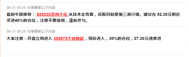 08月31日张老实战直播主要推荐 600230沧州大化,300670大烨智能,300643万通智控 。目前两只个股获利中。