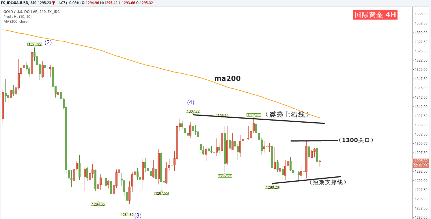 日内其实并没有交易机会,非要在这5美金左右的震荡中找利润只能是投机博取成功率而已。如图:200均线向下运行,压制位逐渐和1307一线重合,这里是震荡带的上沿;短期1300整关口是日内多空线,下方1289.2开始低点抬升形成日内支撑线。