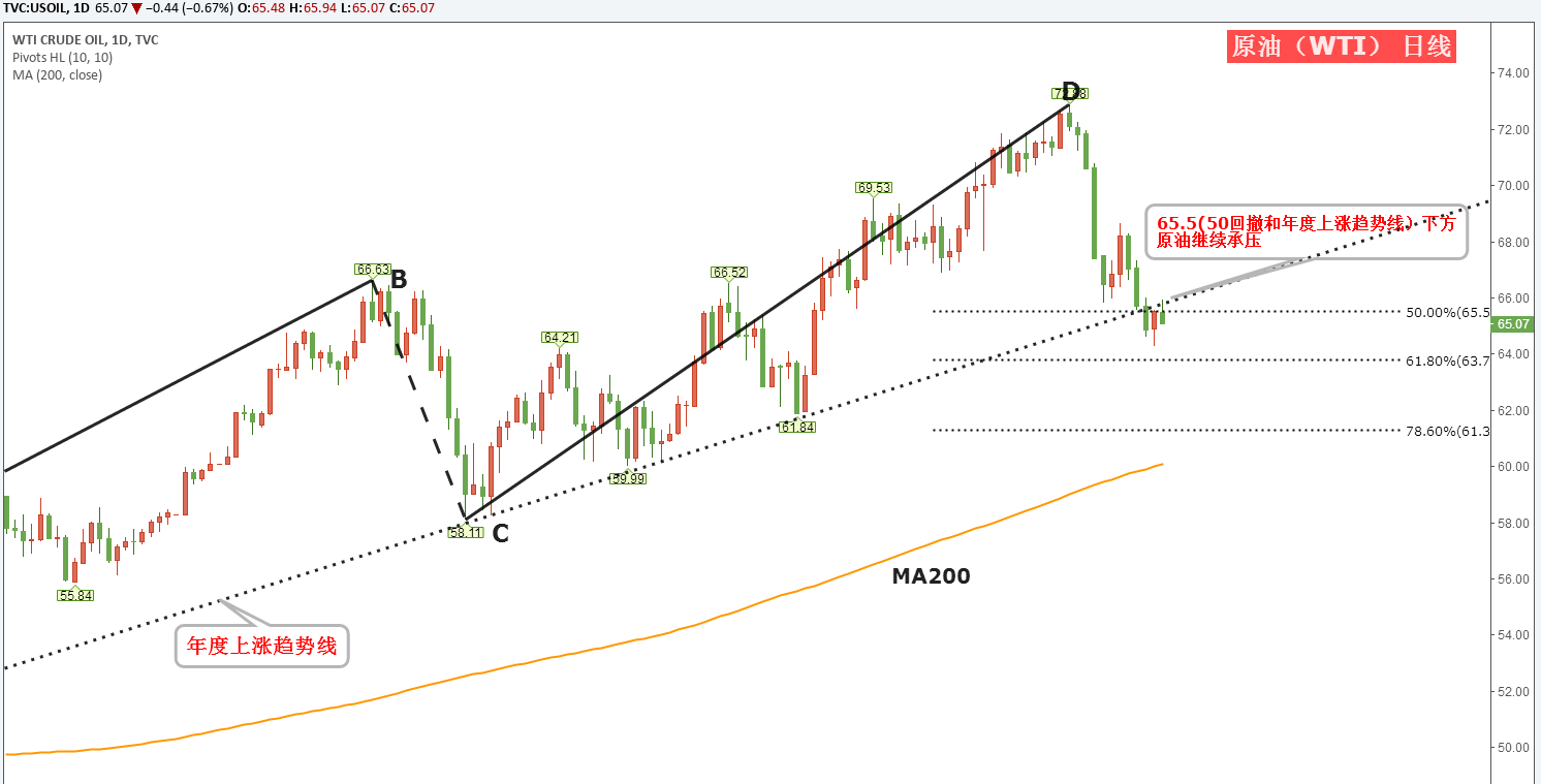 原油65.5今天怎么收日线是关键,65.5是年度上涨趋势线,昨天V反转后今天欧盘再度跌下来。理论上65.5的压制有作用,原油整体会继续下探,若65.5被强势站稳,那么本轮下跌结束。