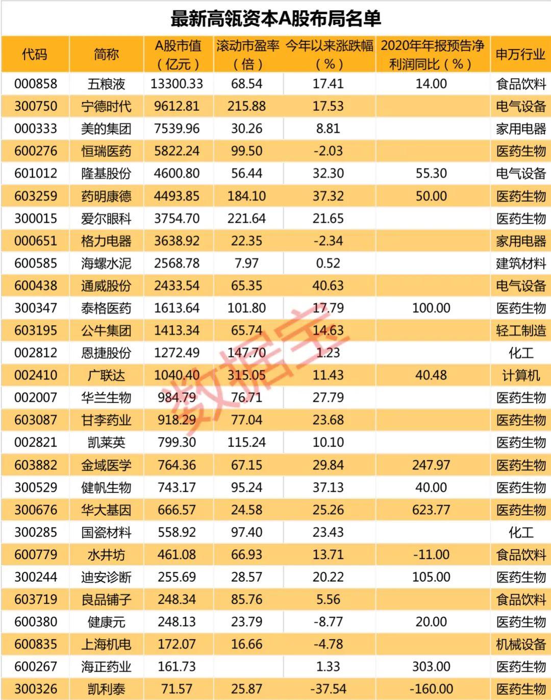 考虑到高瓴资本的投资动向已经成为不少投资者的参考标本,证券时报数据宝梳理出最新高瓴资本在A股市场上布局的股票全名单,合计28股。高瓴资本所持股票主要分布在医药生物、消费、新能源、电气设备和家用电器等板块。