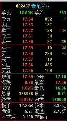 下午开盘,前期推荐的青龙管业002457迅速补仓20%,17.54现价进去,没有进入的投资者可以建仓!