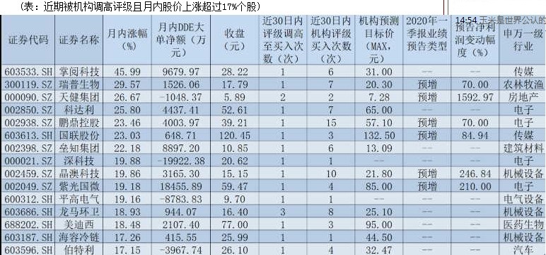 进一步看,上述被机构调高至“买入”评级的187只个股月内普遍表现良好,155只个股4月份以来股价实现上涨,占比逾八成。掌阅科技期间累计涨幅居首,达到45.99%,瑞普生物、天健集团、科达利、鹏鼎控股、国联股份、迈克生物、垒知集团、恩捷股份和卫宁健康等个股期间已实现可观涨幅,均逾20%尽显强势。