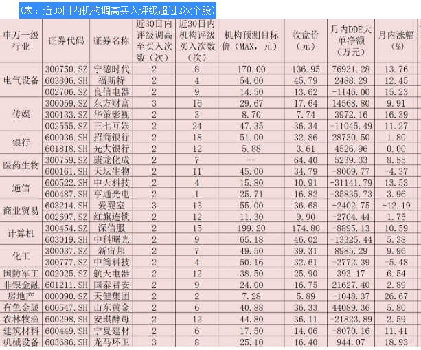 近期,沪深两市股指呈现震荡反弹的态势,一些个股由于前期市场风险的充分释放,投资价值逐渐显现,吸引了各路资金的目光,而机构也纷纷发表研报调高部分个股投资评级,引人关注。近期机构再一次调高部分个股的投资评级,尤其是今年一季度业绩预期向好的绩优股更具投资价值,后市表现值得期待。