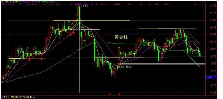 4、三点确定一个平面,下面最后一个低点要求不创前低。此股前6月9日的放量大阳线,被称为黄金柱。最低9.53元,开盘价9.62元。今收9.75元,最低9.73元。10个月线9.74元。此线不破,就是机会。