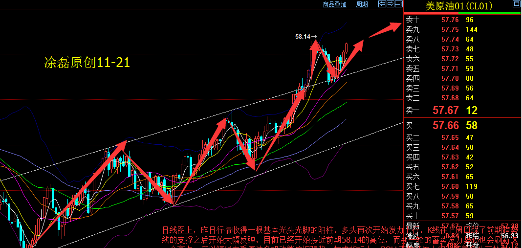 日线图上,昨日行情收得一根基本光头光脚的阳柱,多头再次开始发力上行,K线在上周回踩了前期趋势线的支撑之后开始大幅反弹,目前已经开始接近前期58.14的高位,而新一轮的蓄势发力势必也会刷新这一个高点,所以短线来看原油多投动能依旧强势,技术指标上,BOLL带持续的上行,随着多头开始发力,上行动能势必会带着布林带持续的上行发散,而均线图上,MA5如期勾头上行上穿MA10形成金叉,这也再次证明行情多头动能持续开始发力,而短线来看下方回踩测试支撑的力度将会决定本轮反弹的空间,综上所述,原油多头持续发力中,操作上尽量以回测的多单为主。