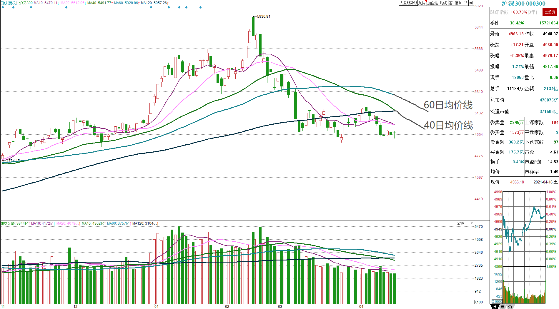 向上,依然会受困于40、60日周期的盘跌抑制和阻碍,这个情况,我们早前已经说明了。整个4月份无法改变40日均价线的盘跌态势,而即便把5月份走完,也改变不了60日均价线的下跌势头。