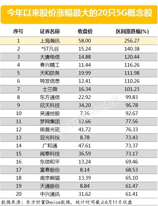 今年以来A股市场上涨幅最大的20只5G概念股: