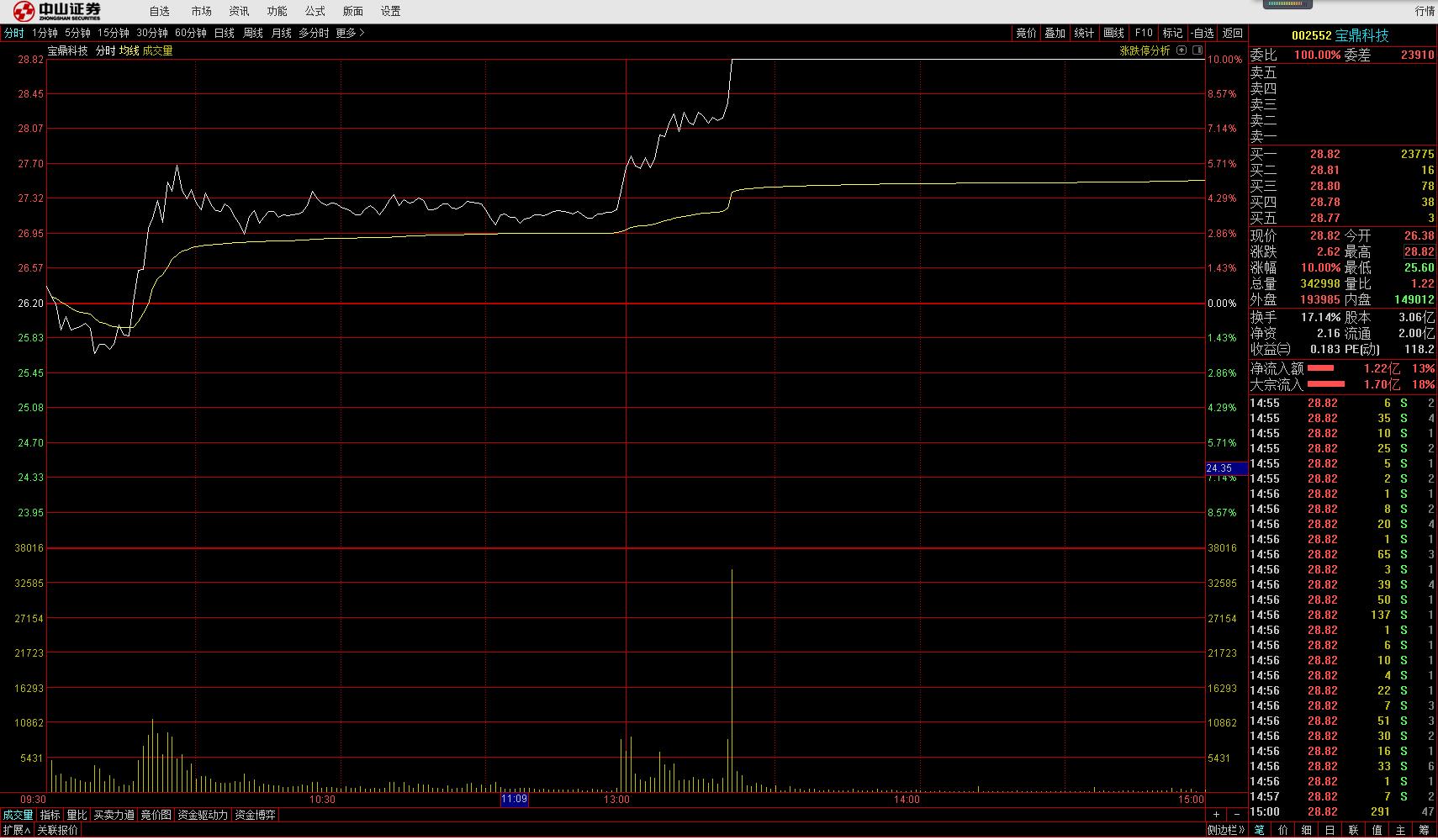 涨起来的是宝鼎科技(002552),上涨3%以上时,因昨天建议战友群买入到收市已经赚了2%以上,于是建议26.97元出来了,一天赚超过5%可以了。没有出的,则享受了涨停待遇。因荐股准确,战友们称此福利过瘾,群里一些久不冒泡的老战友都出来发了言,我自然是非常开心。