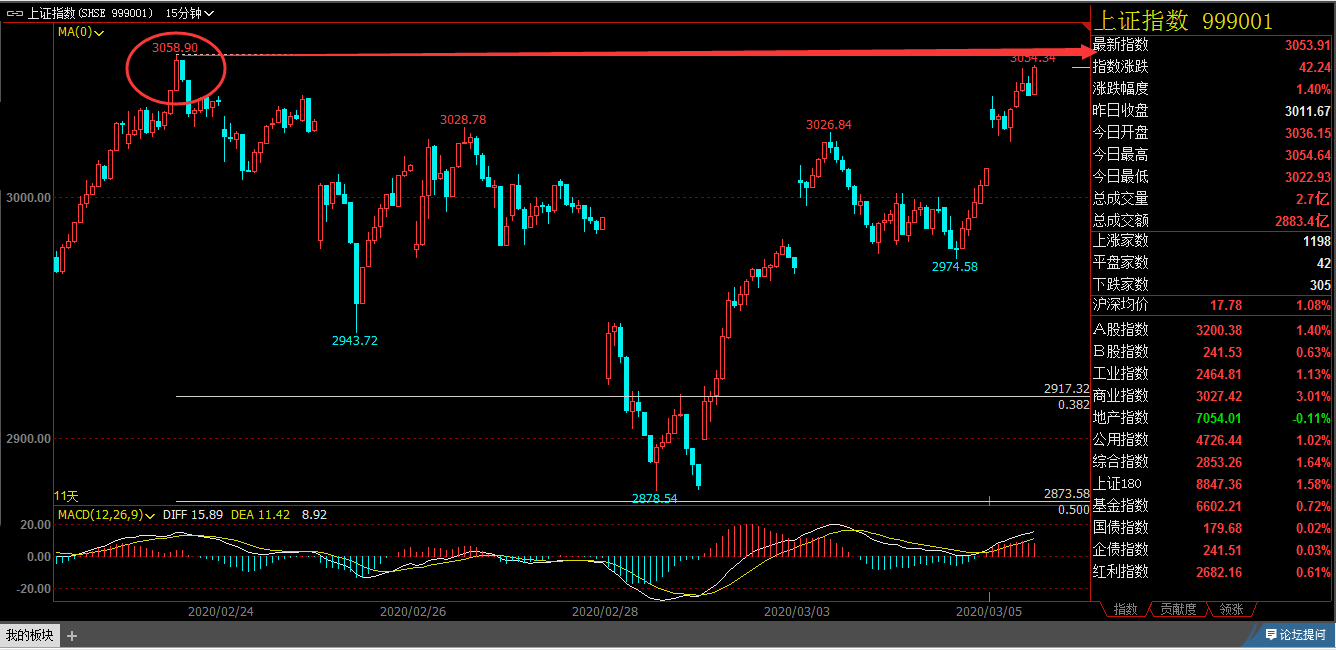 早盘两市小幅分化,上证在权重,蓝筹和金融三驾马车的带动下,多头蓄力测试前高强技术压力,如果多头接下来收复前高这个压力位置,浪形结构将修正为新的上升浪,从时间来看,时间修正的比较短暂,空间幅度在斐波那契位置止跌,不是一个特别符合规范的时空平衡,创业板指数窄幅震荡整理,目前仍运行在b浪反弹结构中。